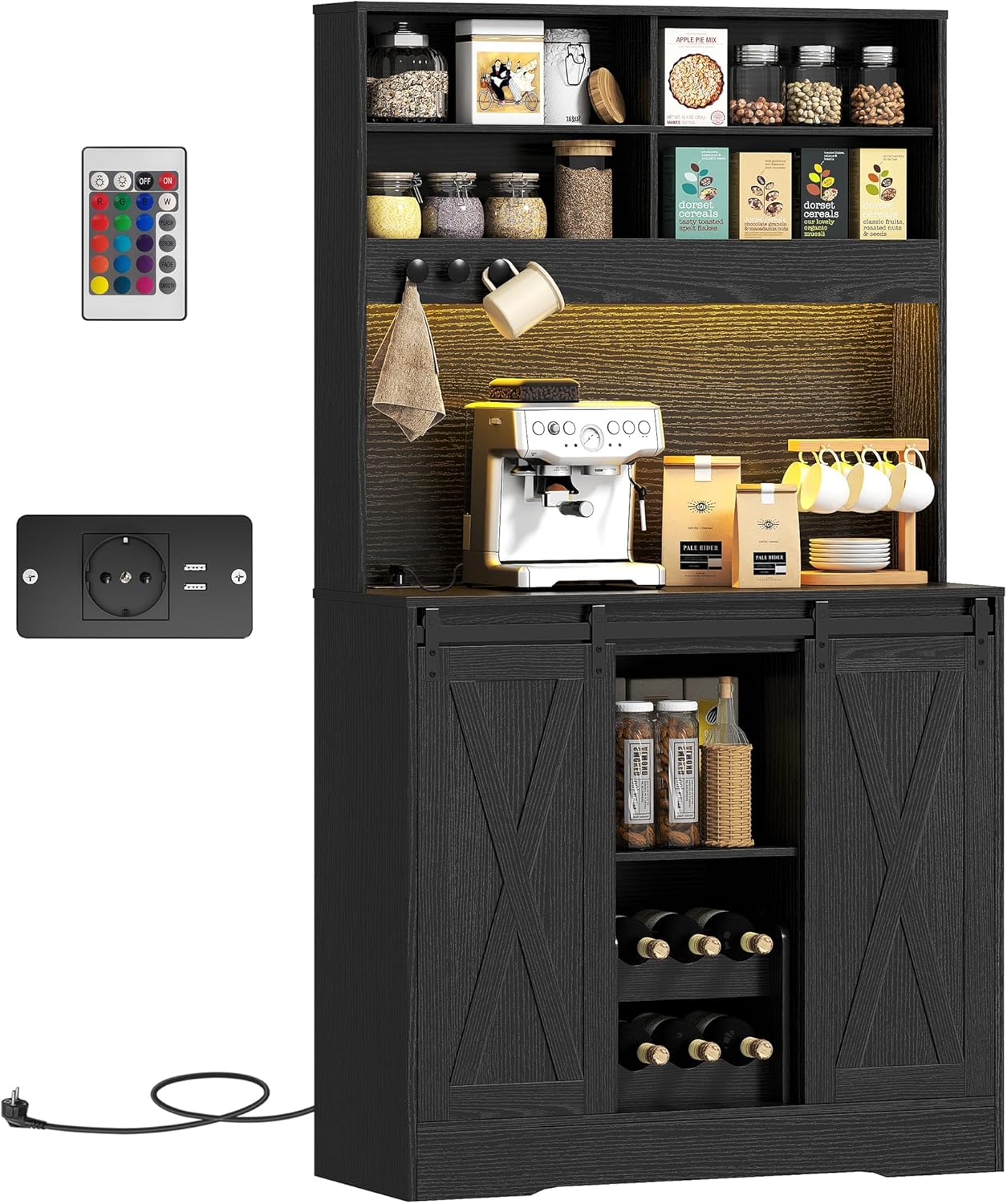 HOMCOM Credenza Cucina, Mobile Dispensa con Prese di Ricarica, Luci LED Regolabili, Portabottiglie Rimovibile per 6 Bottiglie, Mobile Buffet Ripiani Aperti, Ante Scorrevoli, per Sala da Pranzo, Nero